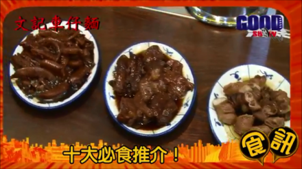 1. 瑞士雞中翼 2. 南乳豬手 3. 玻璃辣魷魚 4. 秘制牛孖根 5. 滷水豬大腸 6. 蠔皇小花菇 7. 柱侯牛腩 8. 自製韭菜餃 9. 手打魚肉 10. 清甜蘿蔔 車仔麵: 1. 油麵配豬大腸,雞翼尖,魚片頭 2. 蕃薯粉配腐皮卷,牛